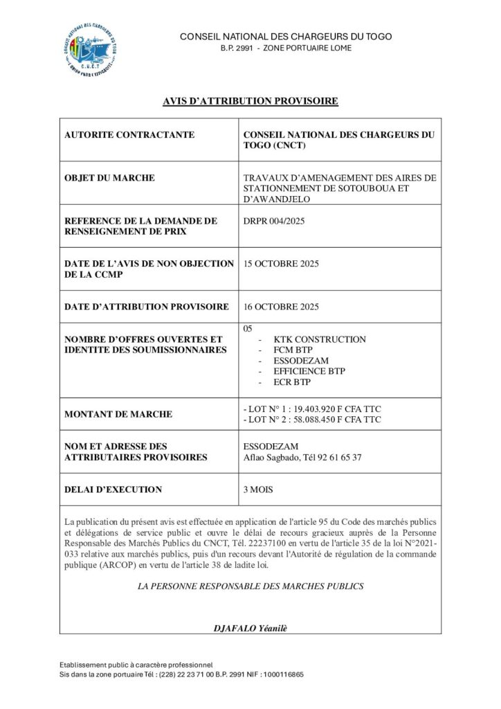 AVIS D’ATTRIBUTION PROVISOIRE DRPR 04 2025 RELATIF AUX TRAVAUX D’AMENAGEMENT DES AIRES DE STATIONNEMENT DE SOTOUBOUA ET D’AWANDJELO